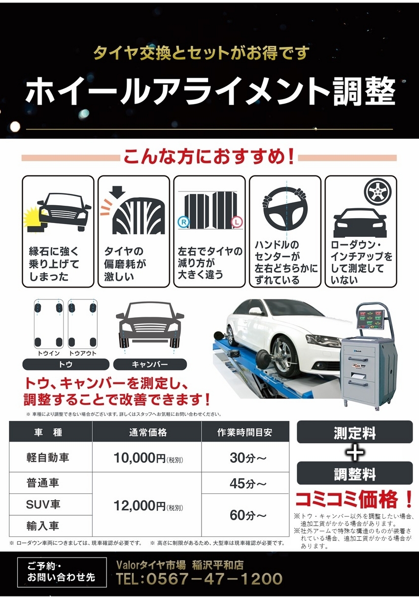 軽自動車は測定料、調整料コミコミ価格で10000円(税別)、普通車、SUV車、輸入車はコミコミ価格で12000円(税別)で作業をすることができますので、気になるお客様は是非、バロータイヤ市場稲沢平和店へお越しくださいませ!!