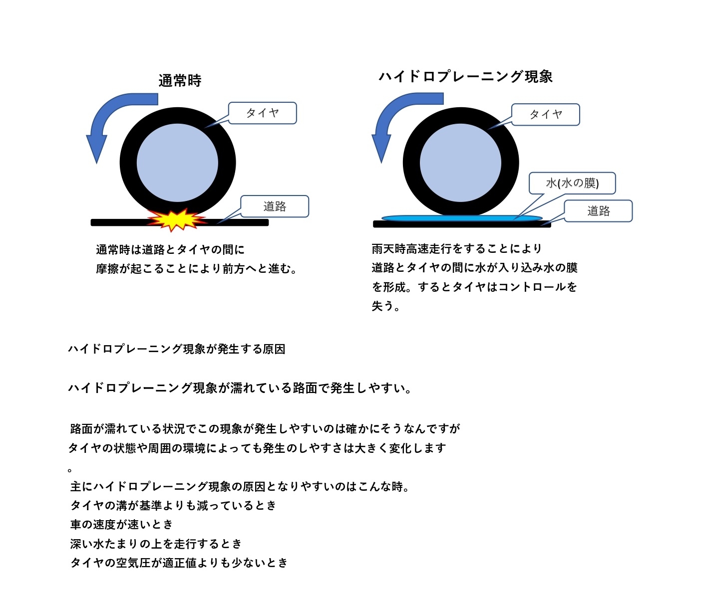 上記のハイドロプレーニング現象が起きやすくなります。