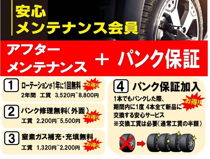 当店でタイヤご購入時に安心メンテナンス会員になっていただくと、2年間のメンテナンス+パンク保証がセットになった安心サポートを受けていただけます(`・ω・´)✨
