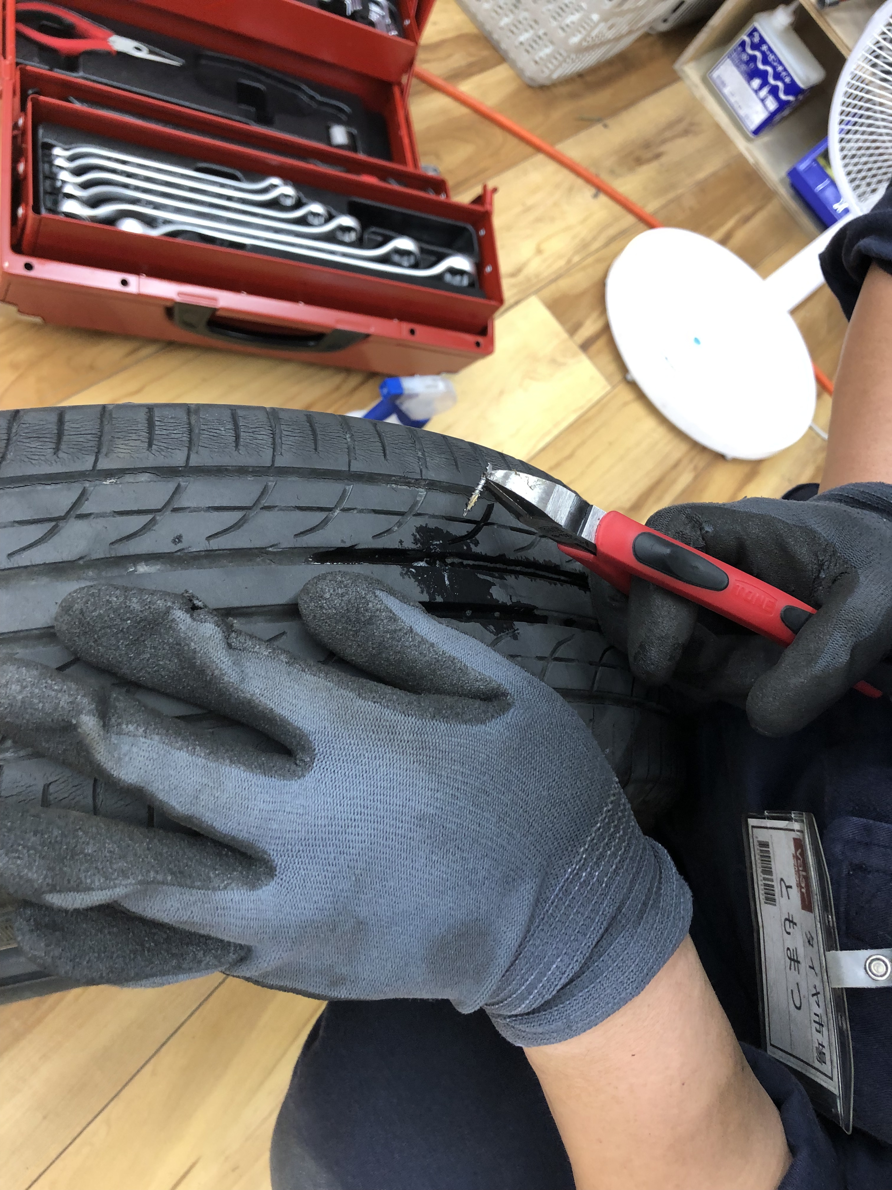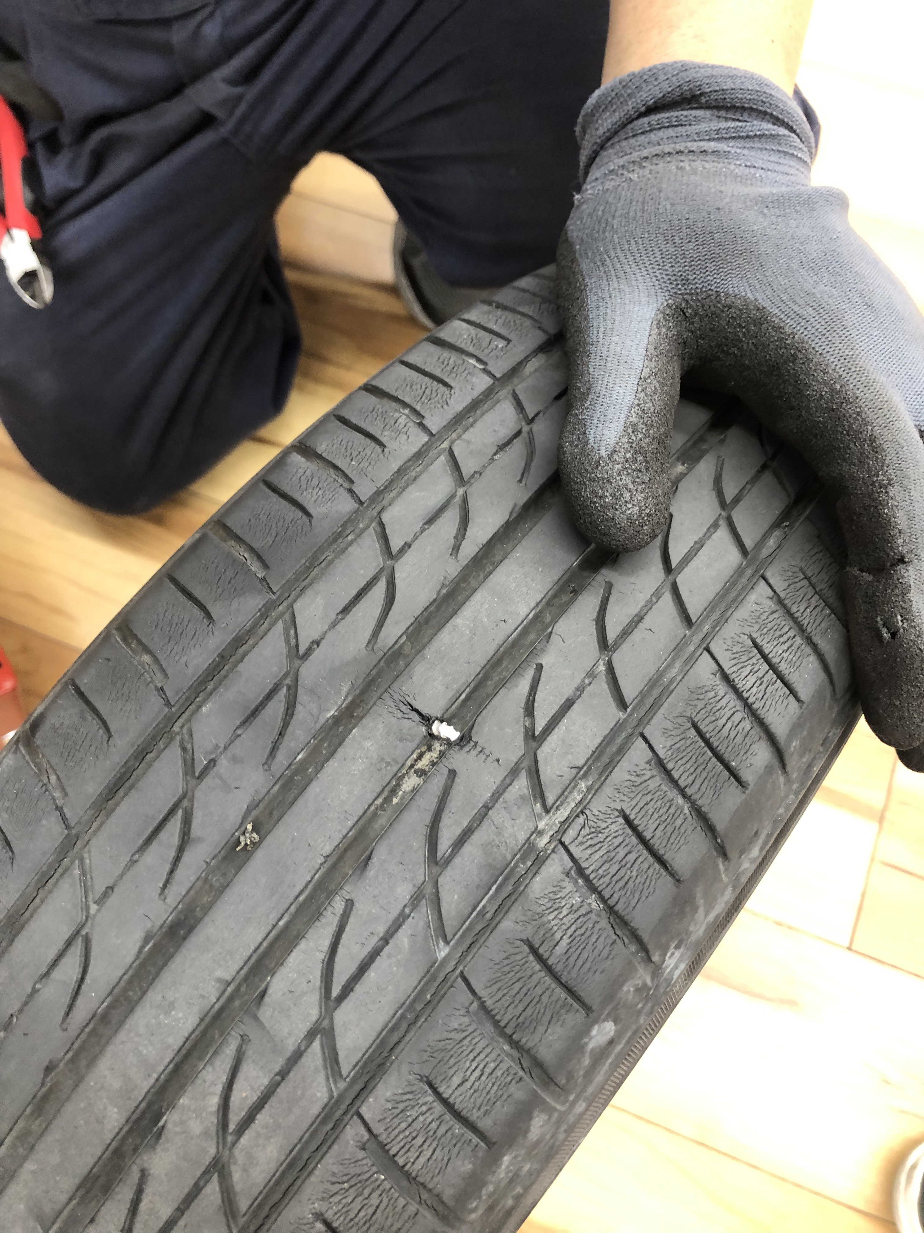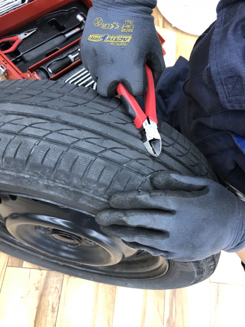 今回のお客様はタイヤの外面(道路と接する部分)に釘が刺さってしまい、この部分からの空気漏れだったため、パンク修理にて対応させて頂きました。