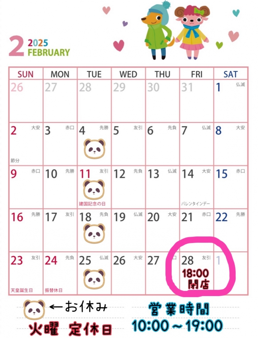 明日2/28(金)は、棚卸しのため誠に勝手ではございますが、18:00に閉店させていただきます。ご了承くださいませ。