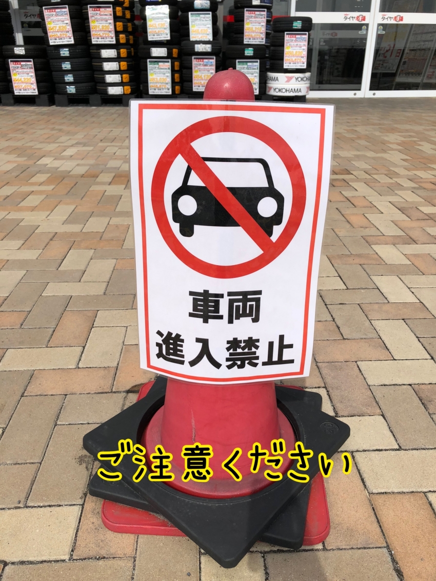 入口付近、タイヤが陳列されているところ、ピット作業場への車両進入は禁止となっております。