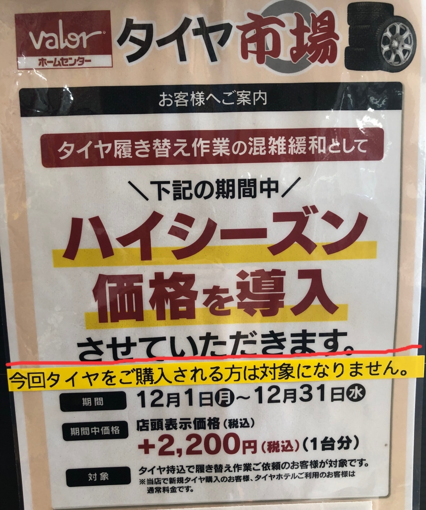 タイヤ市場では12月1日~12月31日の期間中、タイヤ履き替え混雑緩和としてハイシーズン価格を導入させて頂きます。