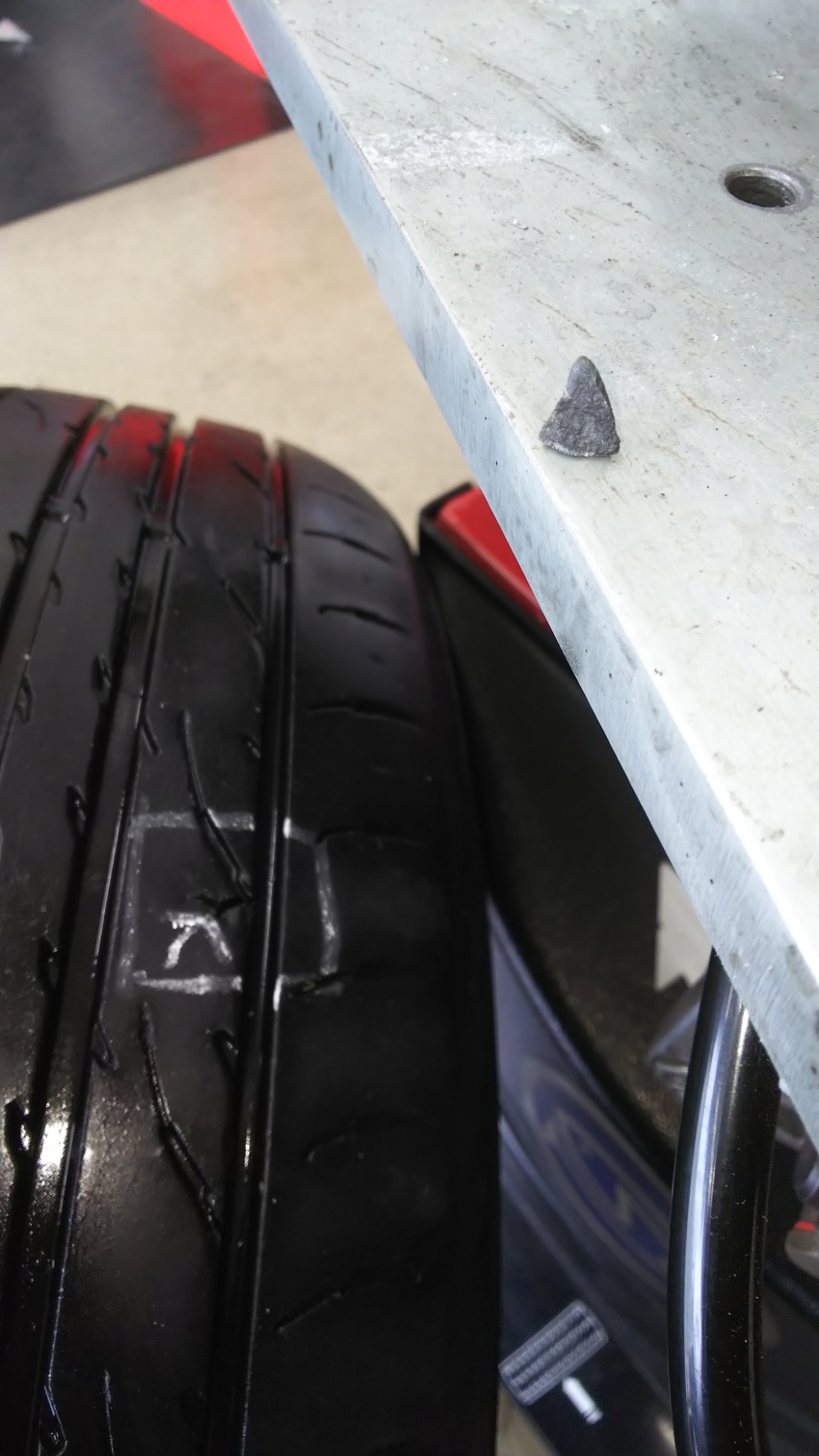車をピットに入れてタイヤを外して確認してみると、