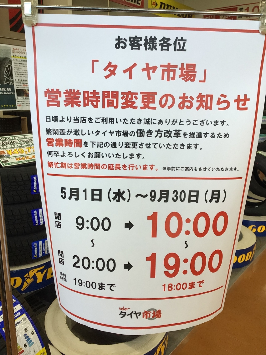 タイヤ市場営業時間変更のお知らせ