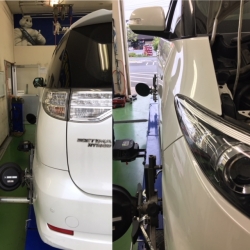 車体にキズが有ましたのでお客様にお伺いしたところ、少し前に強く縁石に乗り上げてしまったとのことでした。アライメントテスターにて測定したところ、乗り上げてしまった側のトゥーに大きな狂いが生じていました!メーカー指定の基準値に調整し作業終了となりました!!