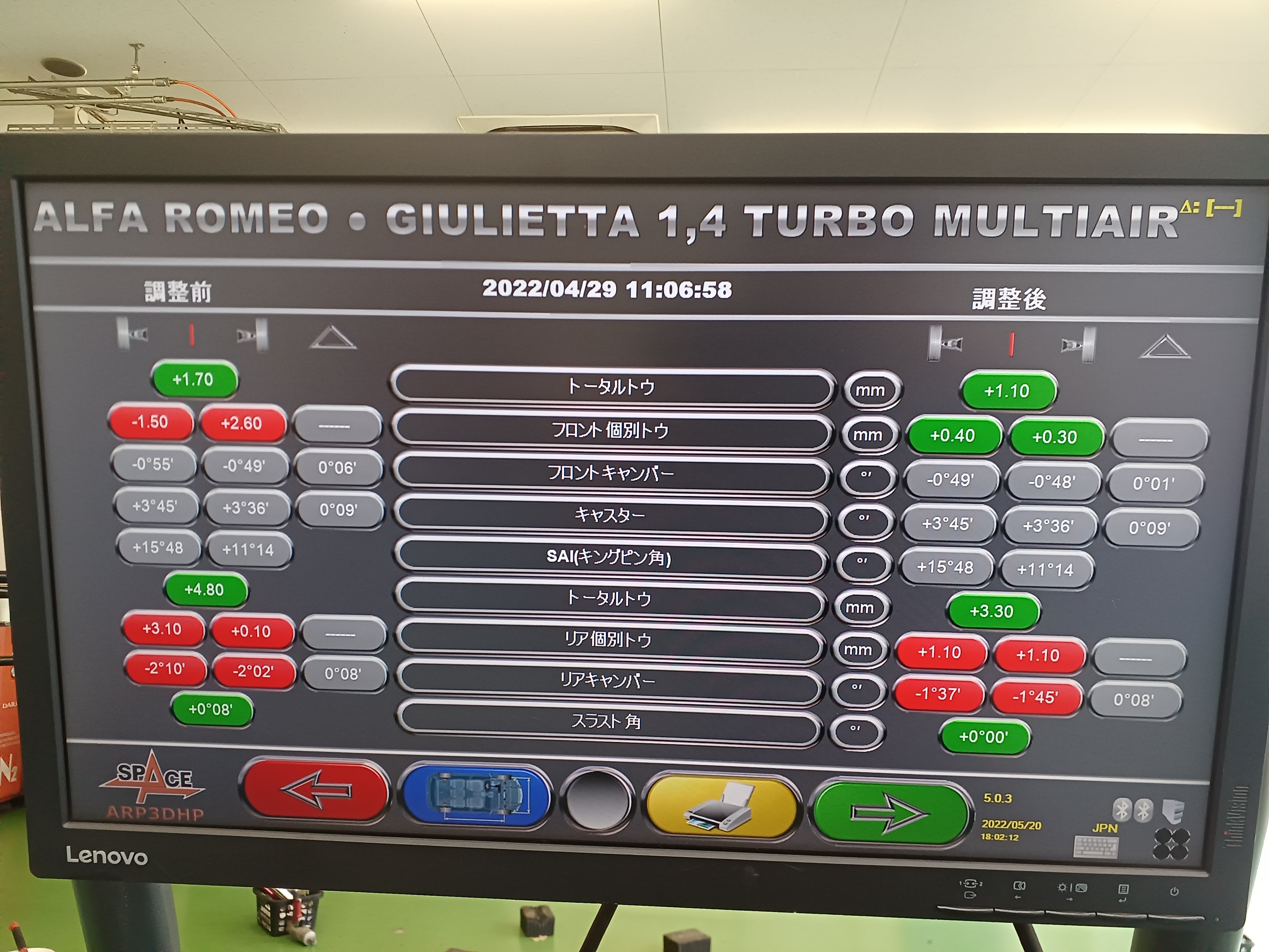 アルファロメオジュリエッタのアライメント調整させていただきました!