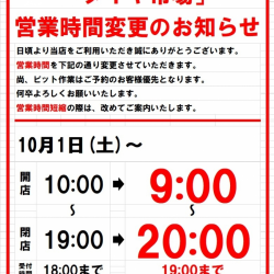 AM9:00~PM8:00(ピット作業受付:AM9:00~PM7:00)1月/2月/5月/6月/7月/8月/9月