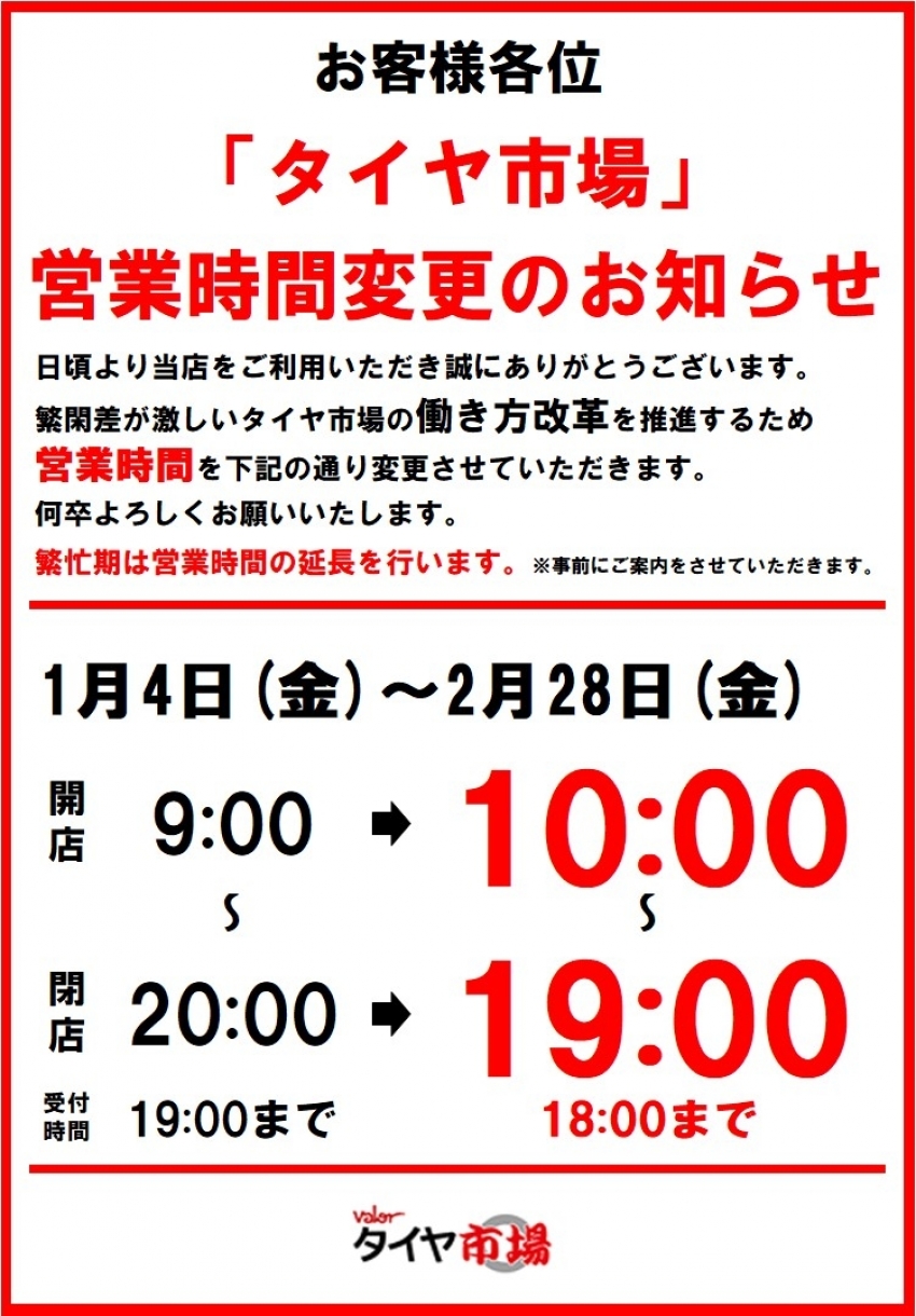 本日1月4日より「タイヤ市場」の営業時間が通常営業時間に戻ります!
