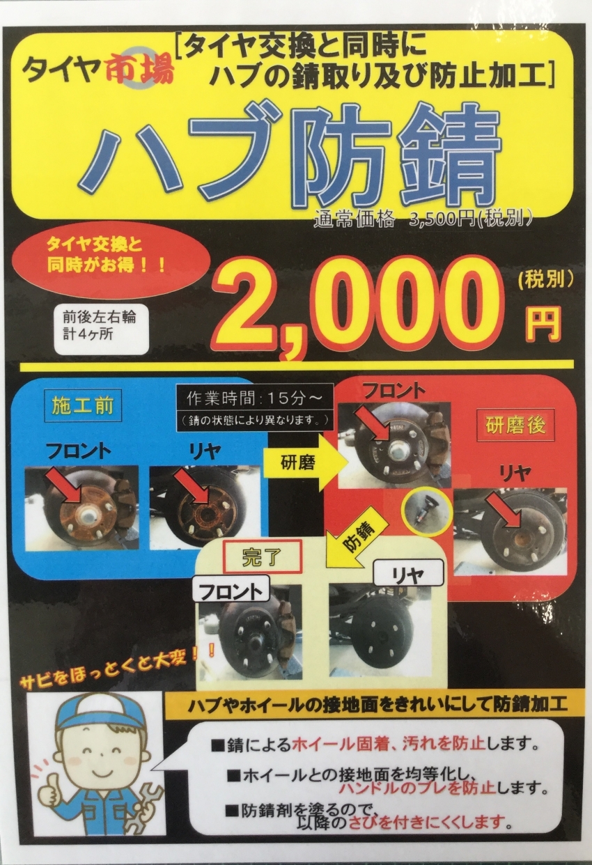 今日はタイヤ市場でおすすめしている『ハブ防錆』についてご紹介します。