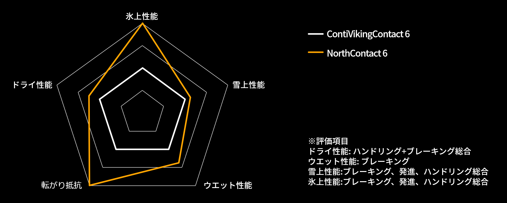 氷雪路路面でのパフォーマンスと、氷雪路以外でのパフォーマンスをわかりやすくまとめました。