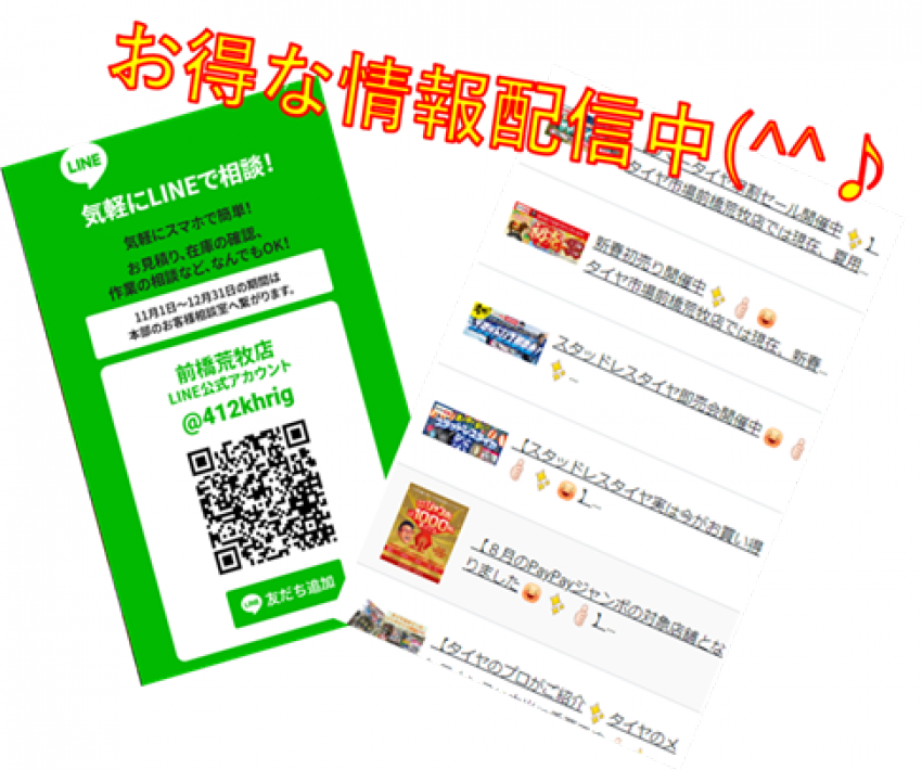 LINEのアカウントを保有しておりまして、お得な情報を配信しておりますが、何と❢❢価格の問合せや作業予約のご相談そしてタイヤに関するご相談なども受け付けております(/・ω・)/