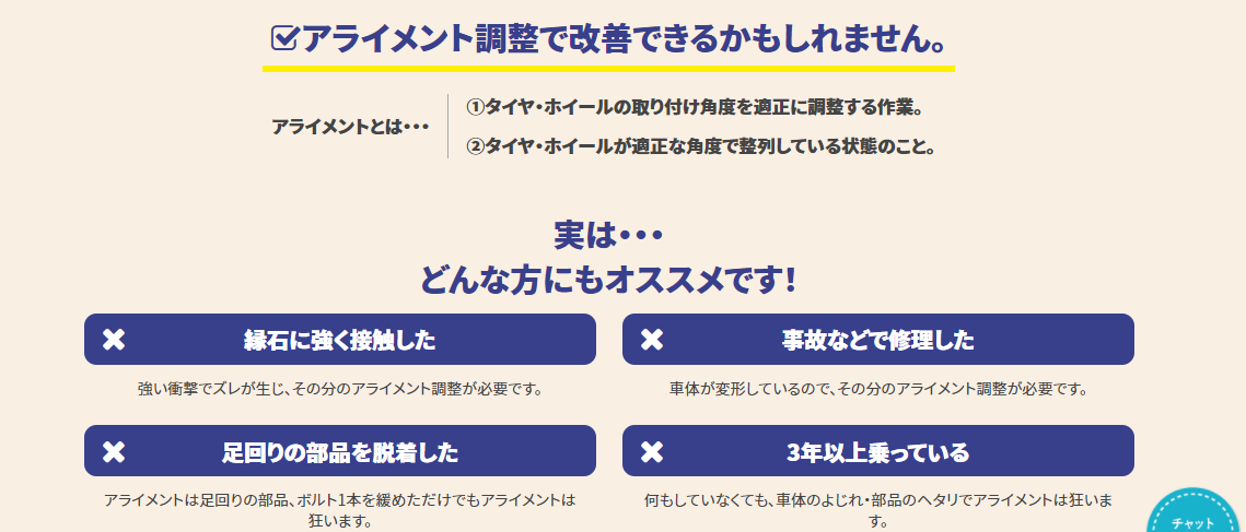 本日は当店で人気のメニューの1つであるアライメント調整に関してご紹介致します!(^^)!