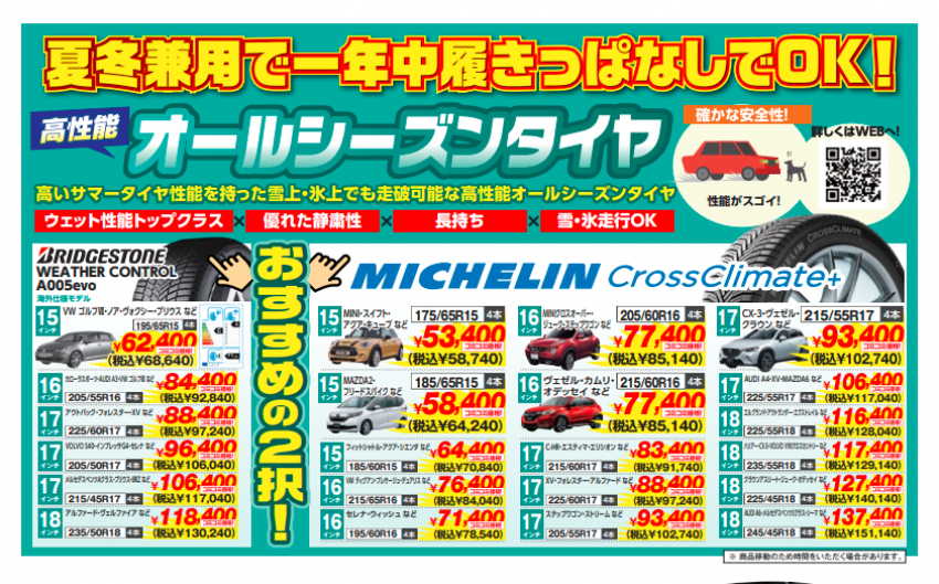ミシュランのクロスクライメート+という商品やブリヂストンのウェザーコントロールという商品になるのですが、こちらの商品はオールシーズンタイヤでありながら、夏タイヤとしての性能も一切の妥協なしのオススメ品です!!