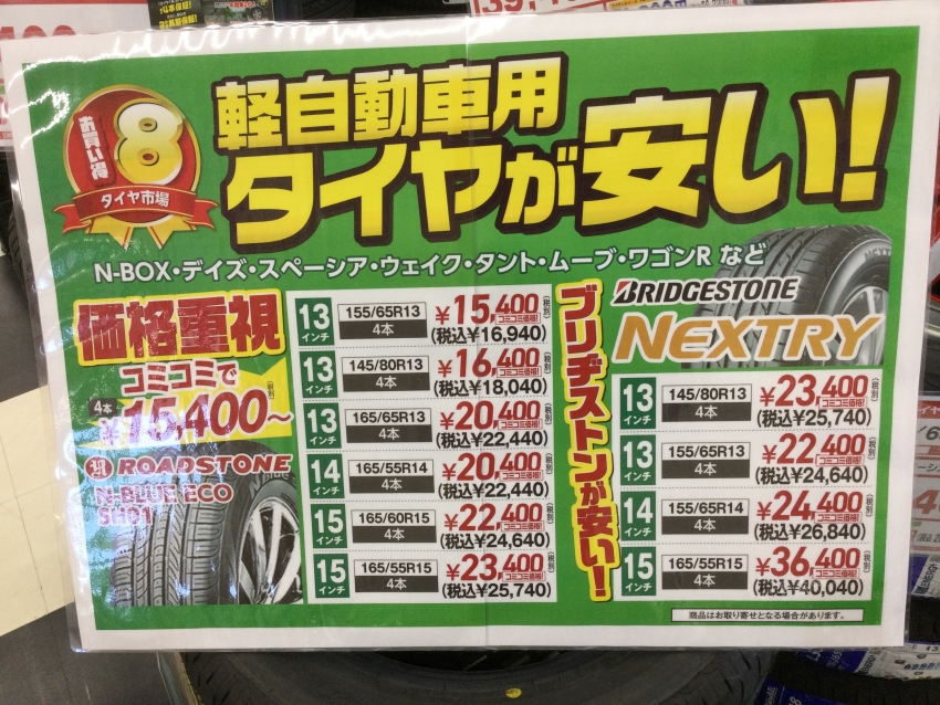 本日の投稿内容ですが、タイヤ市場前橋荒牧店は本日よりセールが始まりましてスタッドレス即売会と出してのセールなのですが、実は夏タイヤの軽自動車サイズにてブリヂストンのネクストリーを大特価でご案内しております(`・ω・´)ゞ