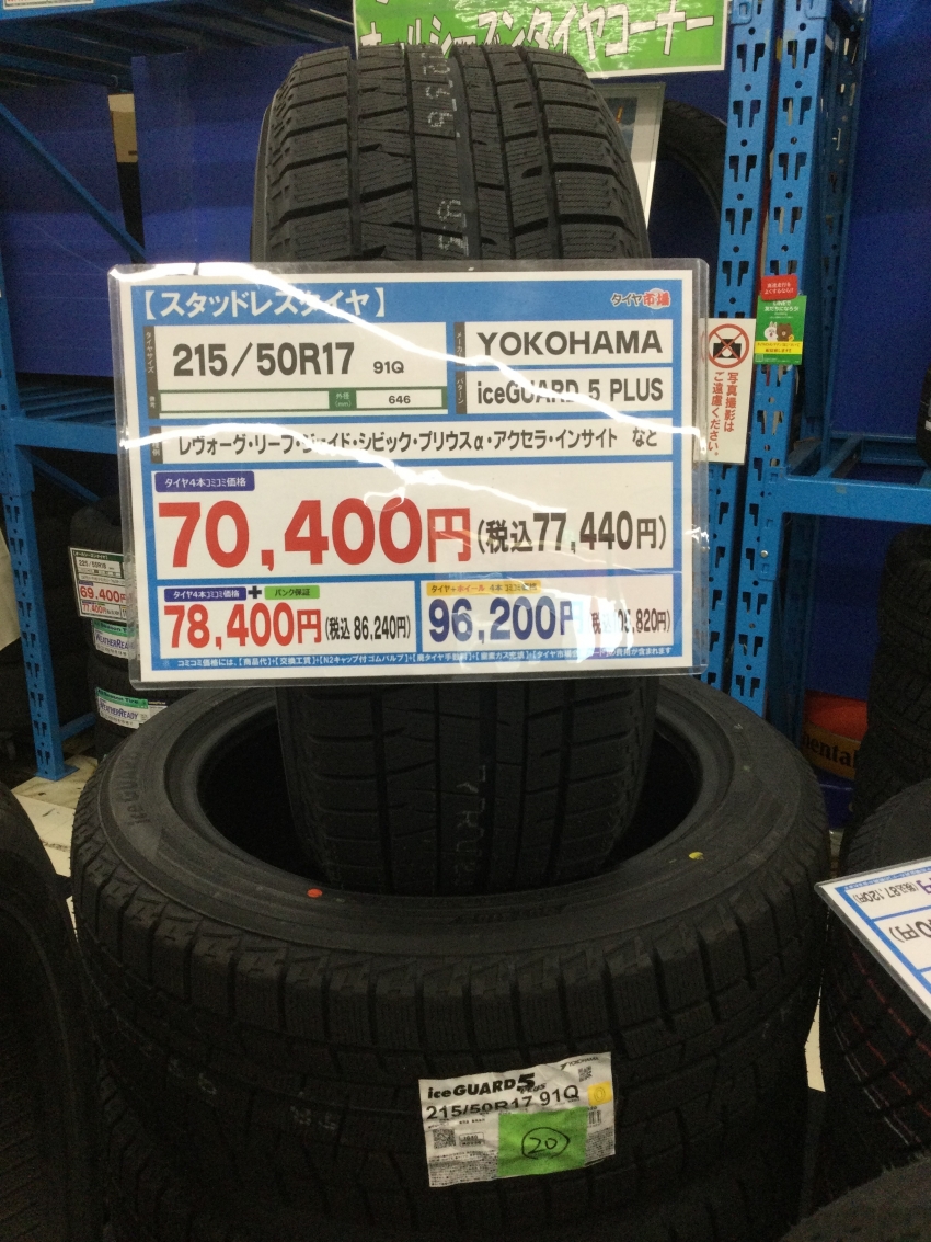 ご紹介するタイヤサイズは、レヴォーグやリーフ等に適合する215/50R17となりまして、今年YOKOHAMAタイヤではアイスガード7というモデルが発売された事により、旧年製スタッドレスを数量限定ですが大特価で仕入れる事が出来ました!(^^)!