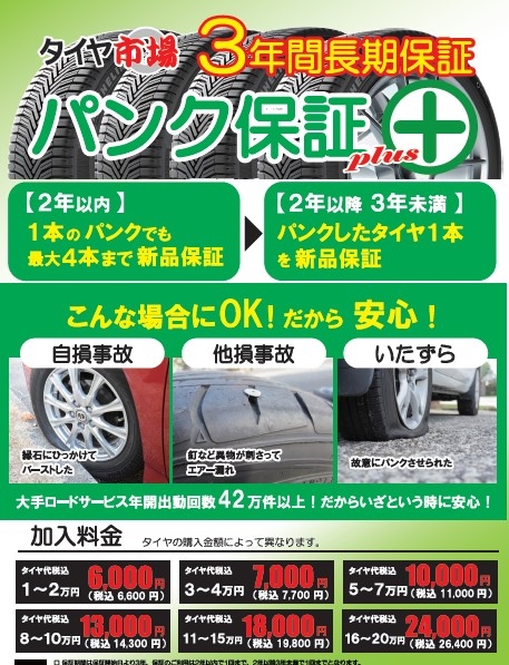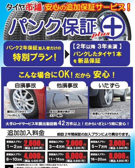 今までは、二年間の保証のメニューしかありませんでしたが、お客様より『パンク保証の期間が切れてしまった際やパンク保証を使用してタイヤ交換をした後の延長プランがあると良いよね』という声がありました!!
