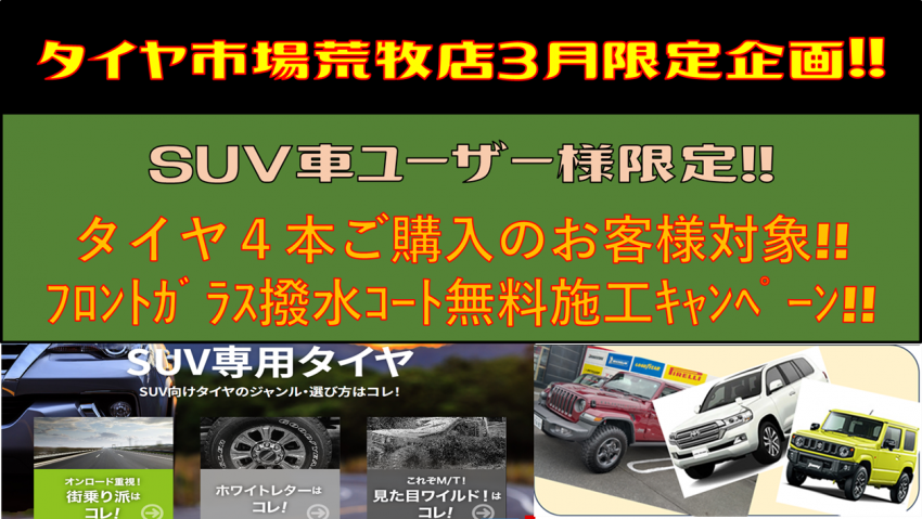 SUV車にお乗りのお客様対象で3月に当店にてタイヤを4本ご購入いただいた場合にフロントガラスの撥水コートを無料施工させていただきます(^^)/