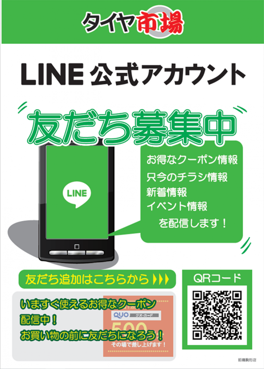 タイヤ市場のラインではここでしか手に入らないクーポンやセール情報などを配布しております♪