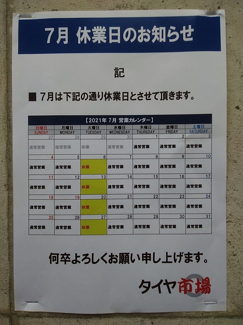 誠に勝手ながら、7月は毎週火曜日を休業日とさせていただきます。