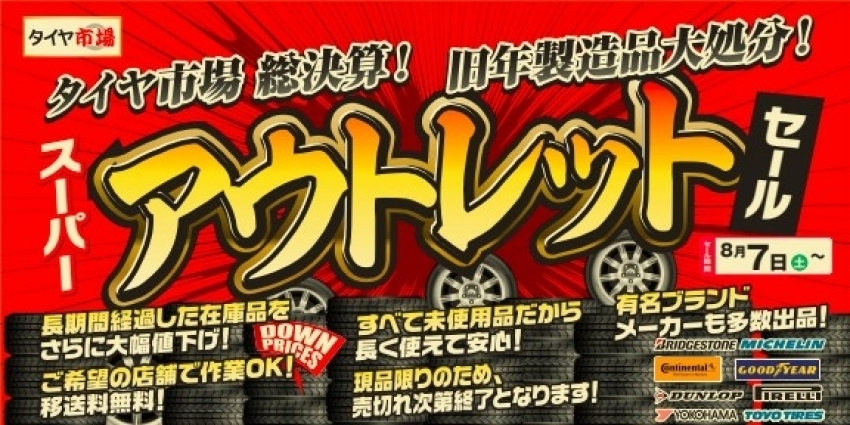 8月7日から、タイヤ市場ではアウトレットセールを実施しています!!