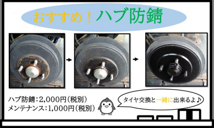 通常コチラのハブ防錆だけのご利用ですと、4カ所で¥3,500(税別)ですが・・・タイヤ交換と同時に行うと、4カ所で¥2,000(税別)で行えることが出来ちゃいます٩( ''ω'' )و