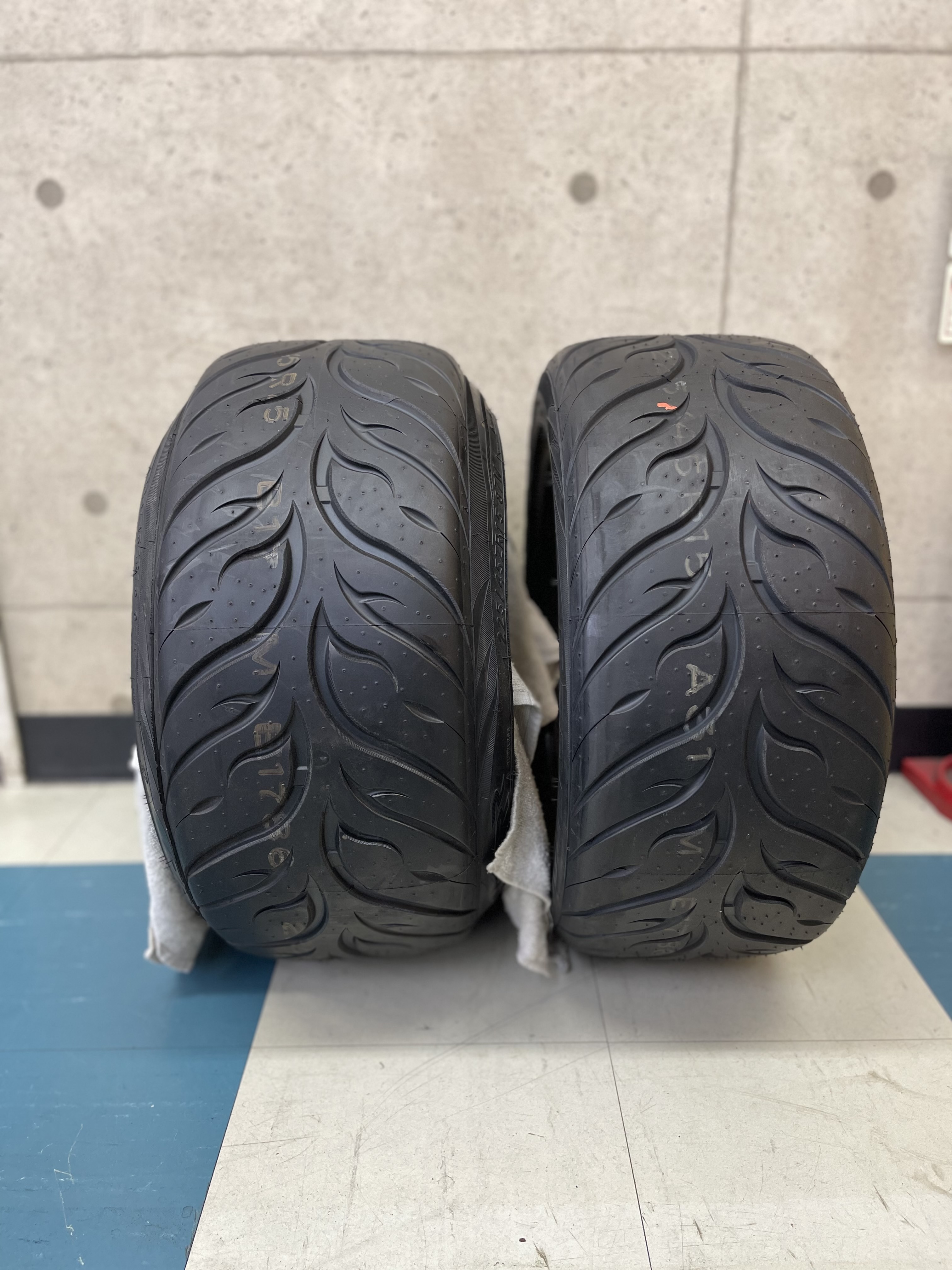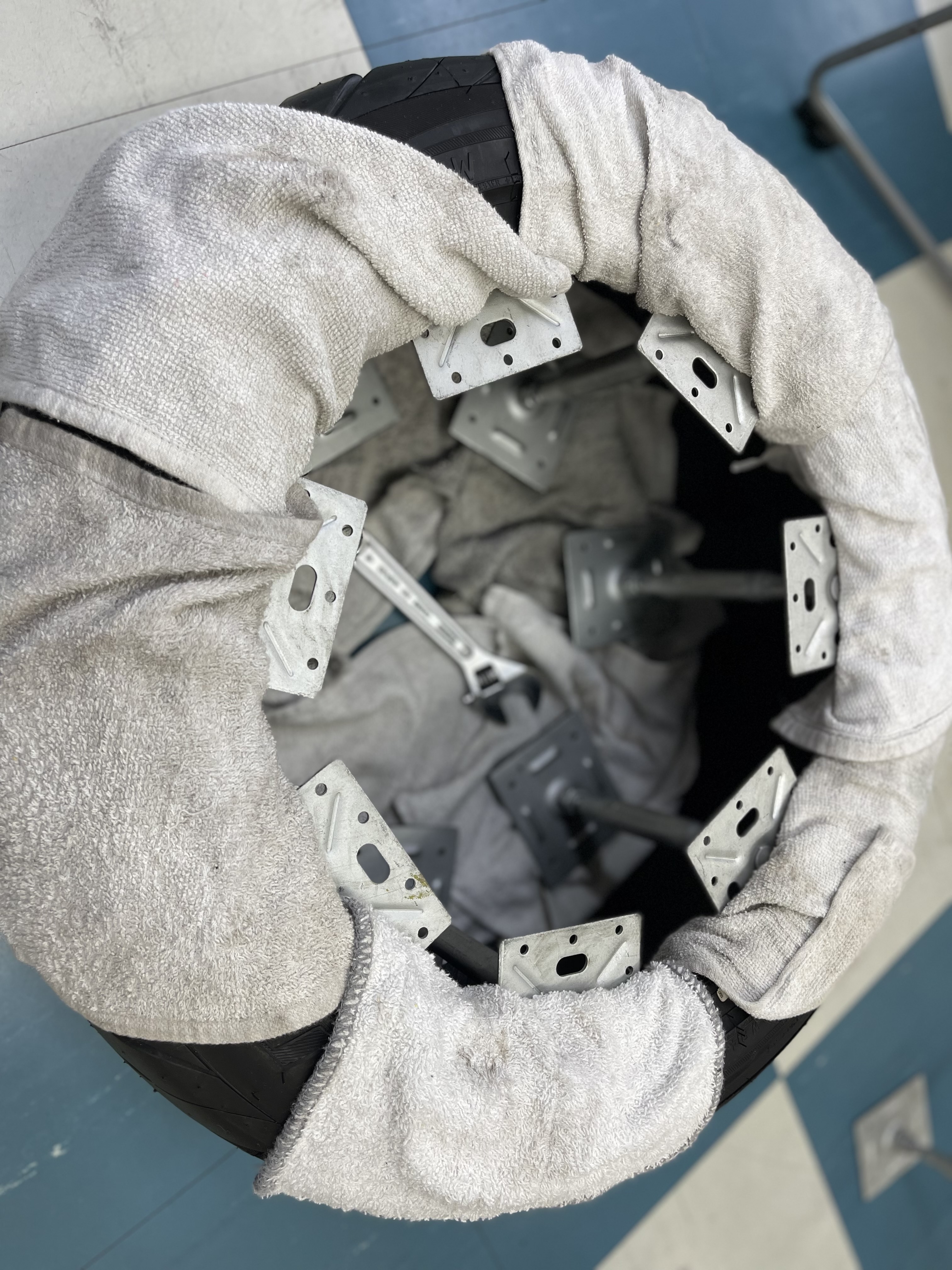 癖付け中タイヤです。サイドウォールの柔らかい部分を広げています。