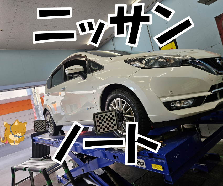 ニッサン✖ノートでアライメント調整 タイヤ市場駒形店!!ディーラーの半額以下で!! 群馬県内外・前橋・桐生・高崎・藤岡・伊勢崎・太田・利根・沼田・吾妻.エリアにお住いの方、その他の地域にお住いの方も是非!