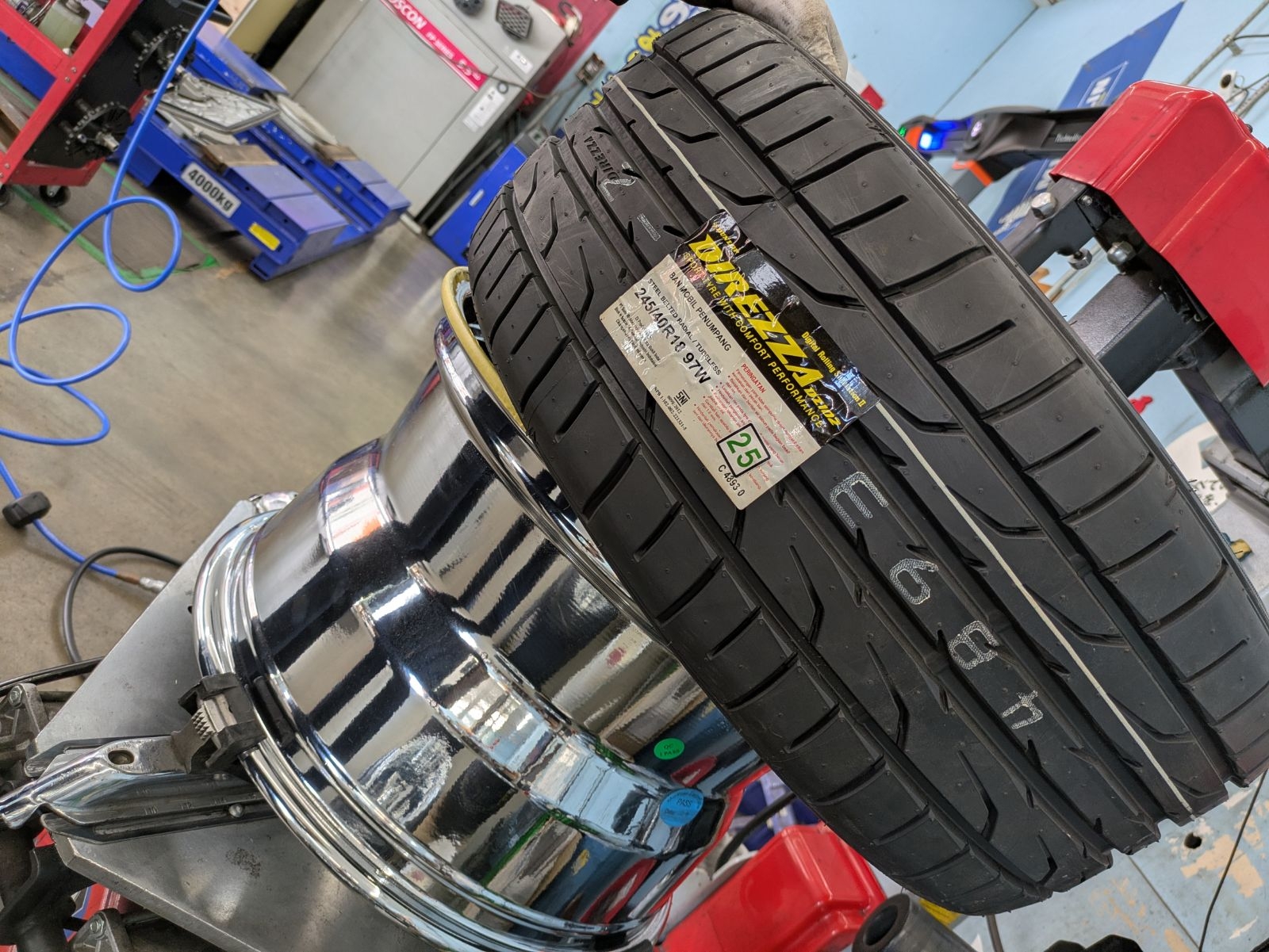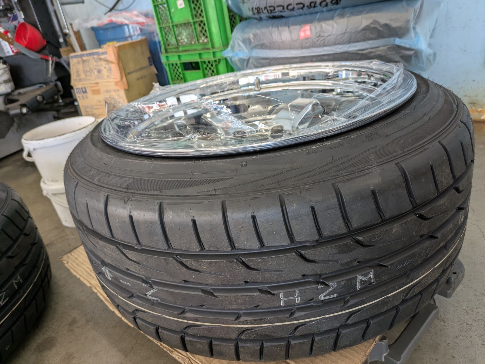 タイヤ市場では、一般的なタイヤ交換はもちろん、こうしたこだわりのカスタムマッチングや引っ張りタイヤの作業も「奮闘」しております!