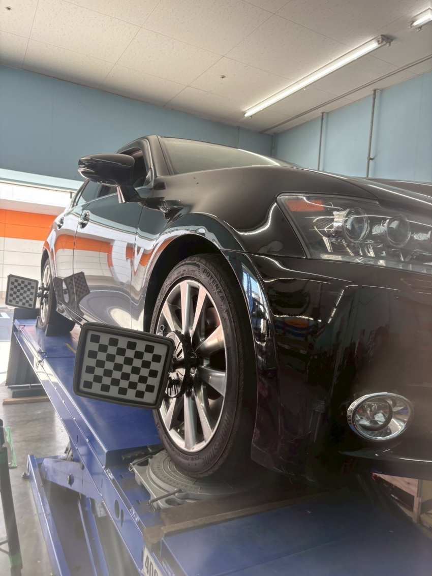 本日ご入店いただいたのは、キリッと引き締まった黒のレクサス。 「最近、ハンドルが少し取られる気がするんだよね」というご相談でした。