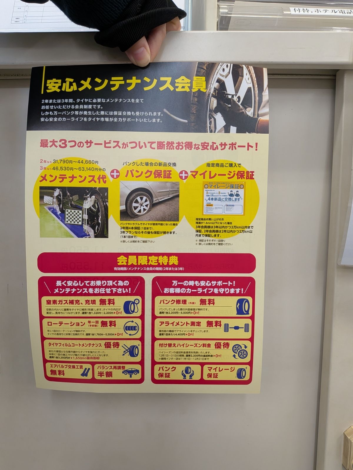 お客様が加入されていた内容を確認すると...バッチリ保証対象! 今回、釘が刺さったのは1本だけでしたが、この保証の凄いところは**「1本のパンクでも、4本すべて新品に交換」**できてしまうこと。