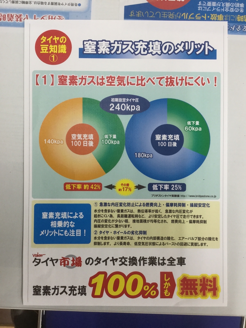 タイヤ市場ではご購入されたタイヤに窒素ガスを充填するのはもちろん、タイヤを4本ご購入された際にお渡しするメンテナンスカードを見せていただければ、窒素ガスを無料で補充させていただいてます!メンテナンスカードをお持ちのお客様は、ホームセンターにお買い物に来られた際、一度タイヤ市場に立ち寄ってみてはいかがでしょうか。スタッフがすぐに窒素ガスの補充に参ります!