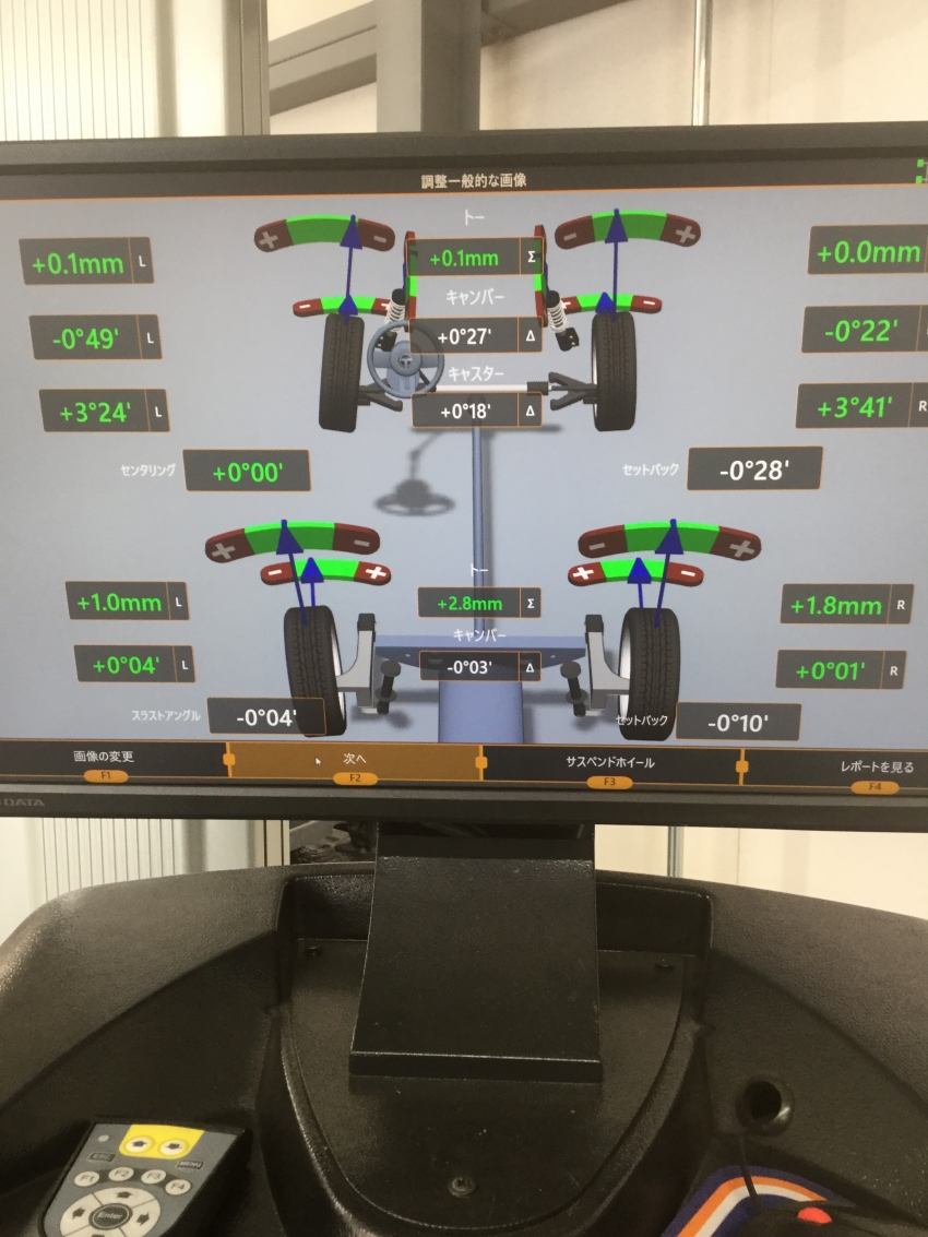 そういった問題をなくすために、左右のタイヤを、メーカーの基準値ど真ん中に調整させていただきました。