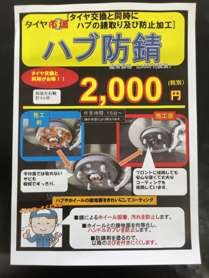 こんにちは、タイヤ市場正木店です今回は「ハブ防錆」の重要性です・タイヤを外した状態IMG_5697[1].JPG・錆びを落とした状態IMG_5699[1].JPG・その上からコーティングしましたIMG_5701[1].JPG