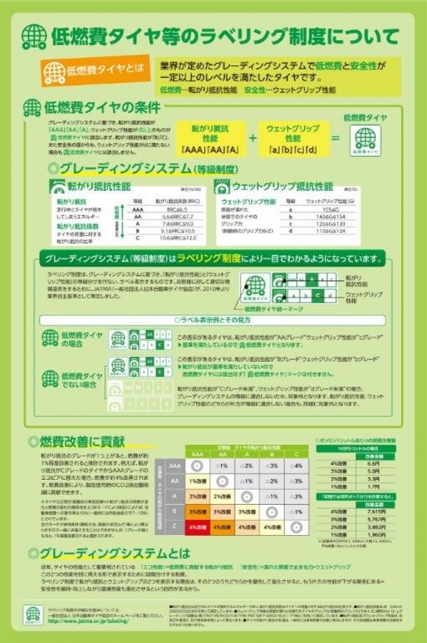 現在では、燃費に関する性能(転がり抵抗性能)と、濡れた路面での制動力など(ウェットグリップ性能)がタイヤのラベルに表示されています。
