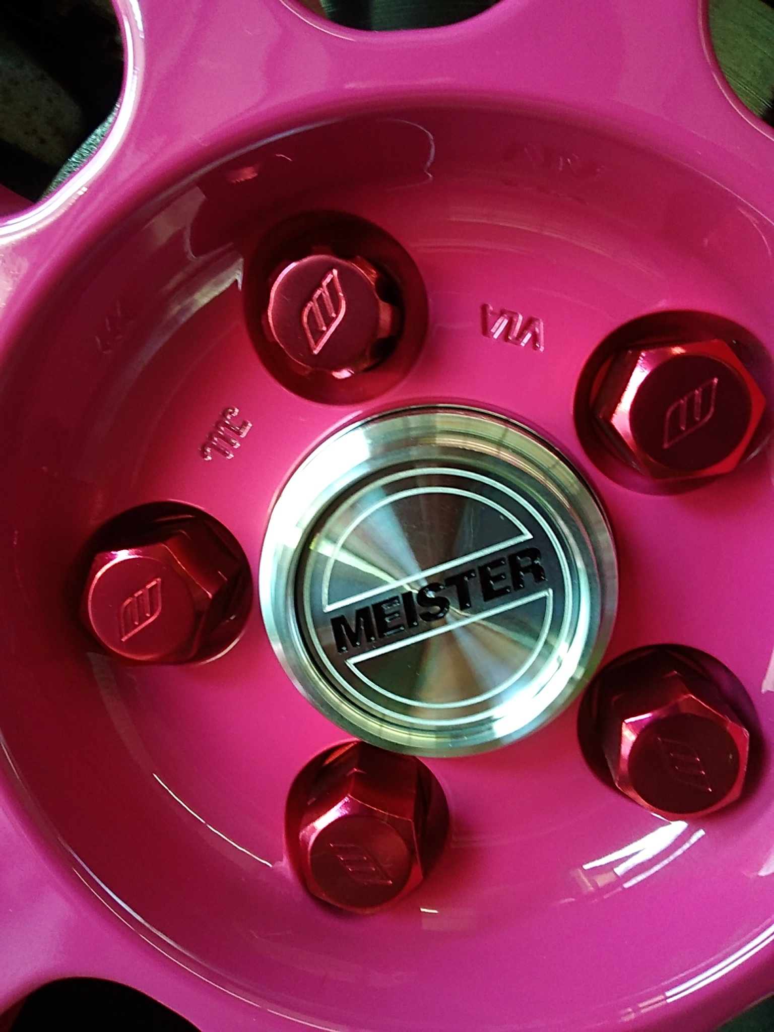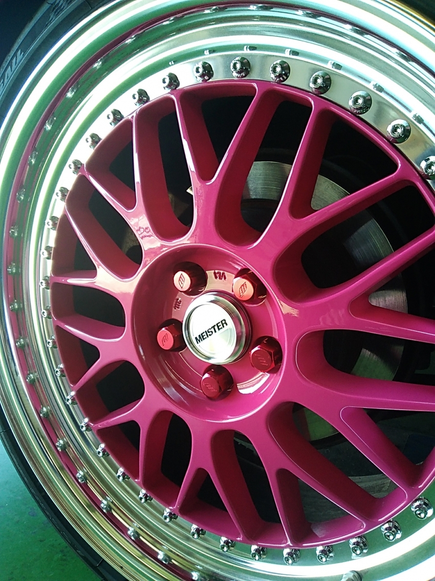 ピンクのホイールとナットにシンプルなデザインでシルバーの輝きのセンターキャップがまたかっこいいですね(*´ω`*)
