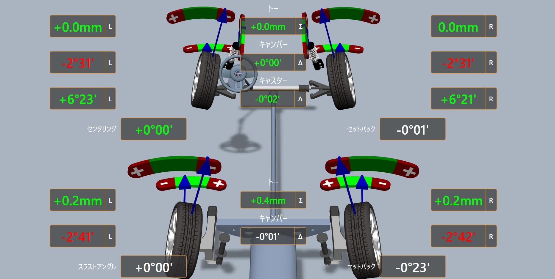 左リアのトー以外は大きなズレはありませんがハンドルセンターズレがありました。