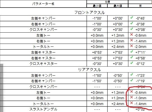 アライメントの数値がずれていないか測定させていただきました。