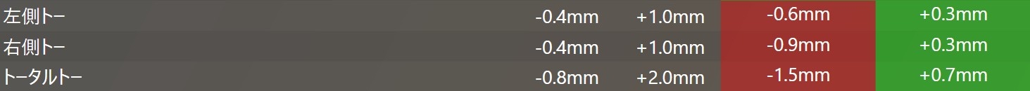 調整前の数値としてはトーアウト(がに股)の状態になっていました。