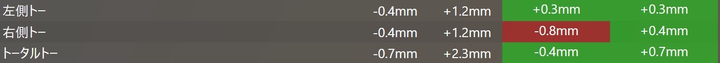 数値ズレとしては右側のトーがトーアウト方向(-0.8ミリ)にズレていおり左右でトーイン、トーアウトがちぐはぐになっていましたので