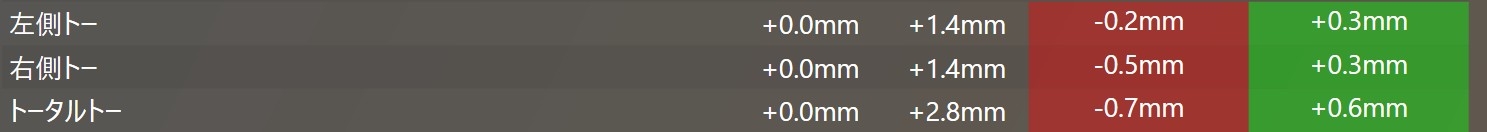 数値のズレとしてはトーがアウト側(がに股方向)にズレていました。