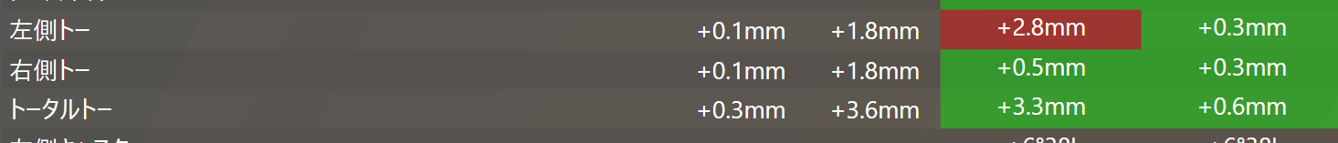 数値のズレとしてはフロント側のトーがイン側にずれていたのとリア側は左右でトーイン、トーアウトがちぐはぐになっていました。