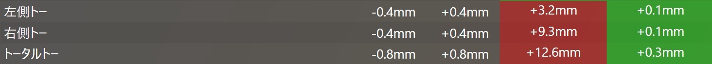 数値のズレとしてはフロント側のトーがイン側にずれていました。