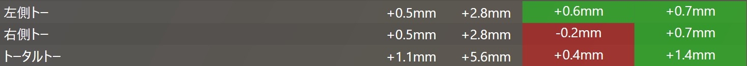 フロント側のトー、リア側のトーになります。
