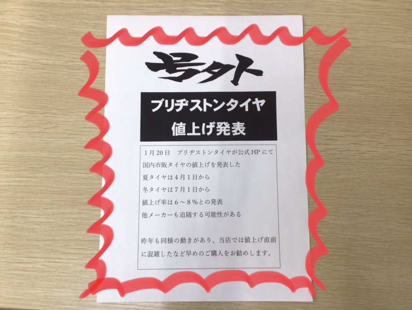 タイヤの値上げ発表!!