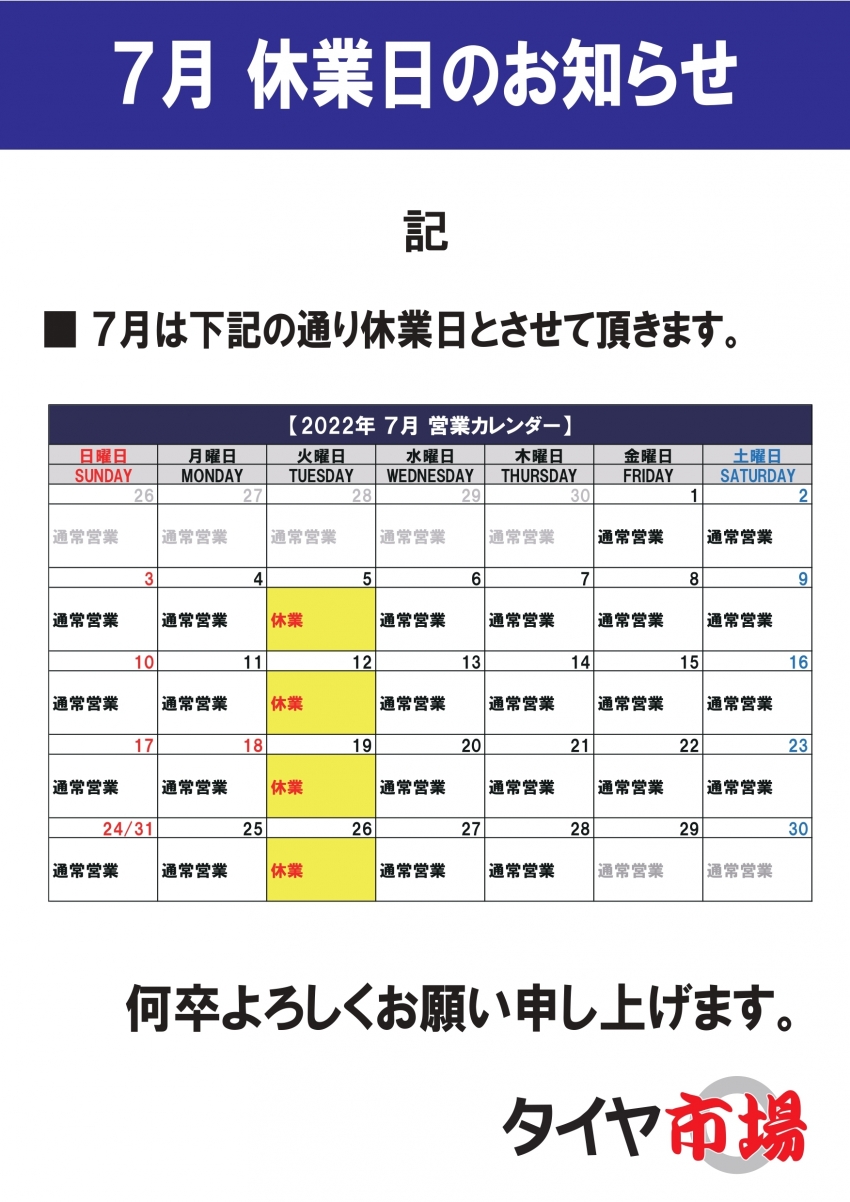 7月店休日のお知らせ!!