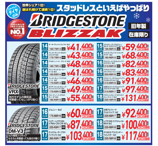 ブリヂストンブリザック、ダンロップウインターマックス等、ブランド限定品や激安スタッドレス等、今しかない「お得商品」多数!!