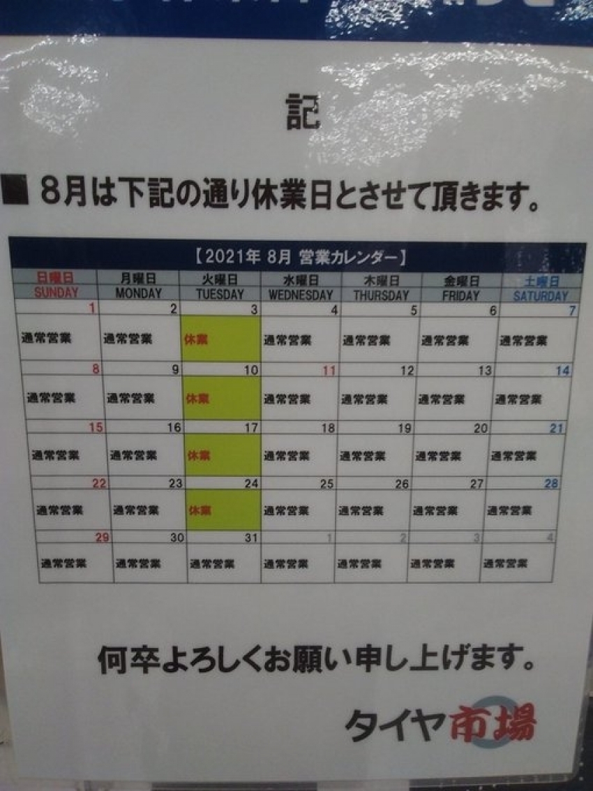 明日8月24日(火)は店休日となります。