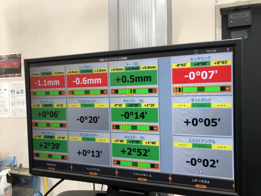 今回は基準値で調整をさせて頂きタイヤの片減りの抑制、