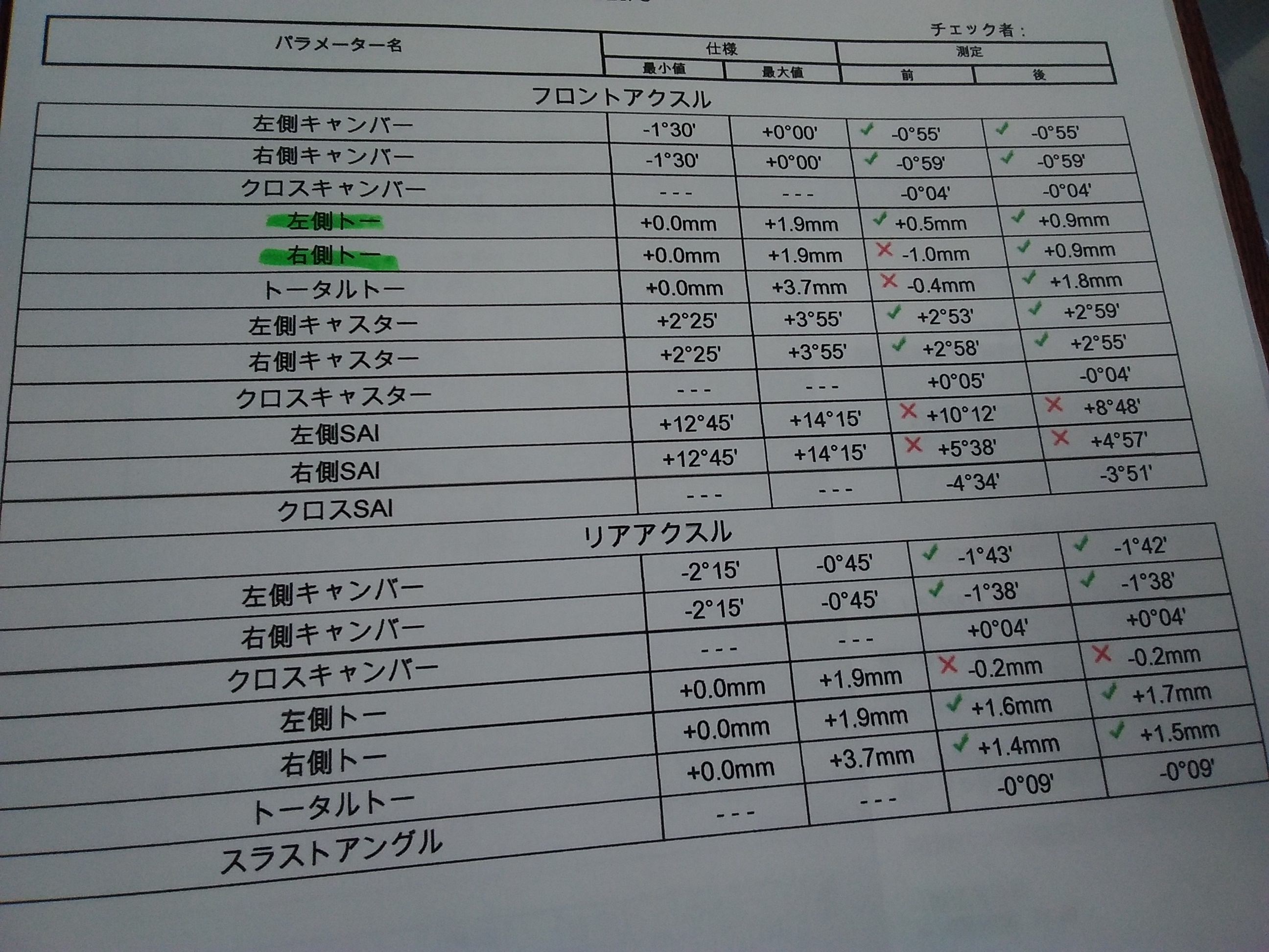 しっかり、左右対称に基準値に調整が